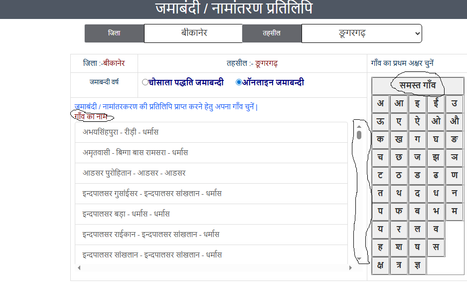 उक्त स्क्रीन में गांवों की सूची में से अपने गांव का चयन करें। उसके बाद निम्न स्क्रीन दिखाई देगीः-