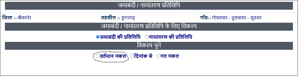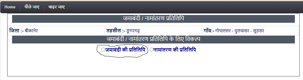 उक्त स्क्रीन में "जमाबन्दी की प्रतिलिपि" पर क्लिक करें। उसके बाद निम्न स्क्रीन दिखाई देगीः-