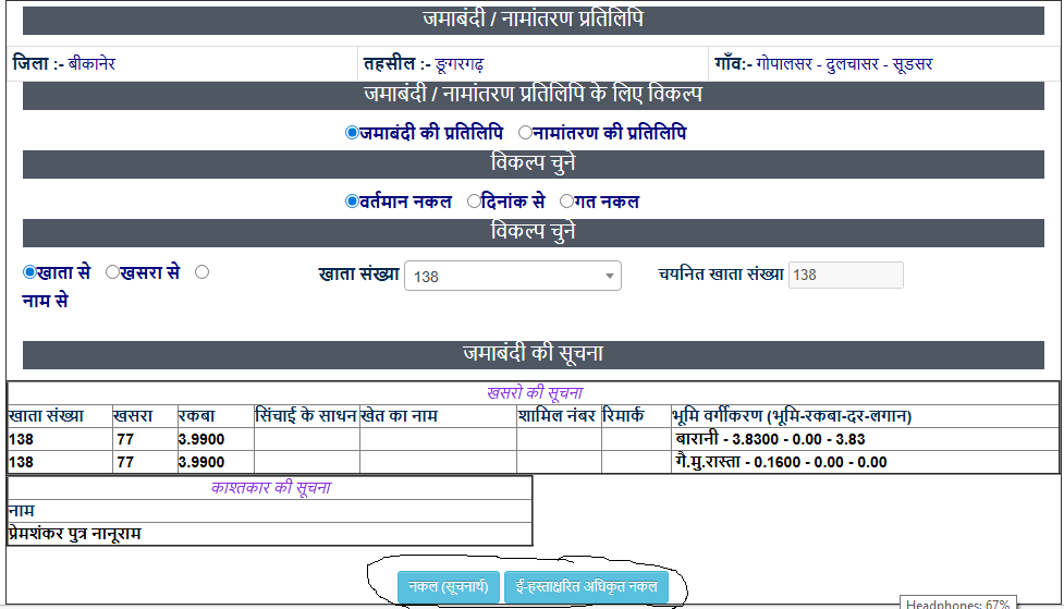 उक्त स्क्रीन में आवेदक का नाम, आवेदक का पता तथा कैप्चा कोड दर्ज कर बटन Verify पर क्लिक करने पर जमाबन्दी की नकल एक अलग विन्डो में आ जाएगी। इसका प्रिन्ट निकाल कर आप काम में ले सकते हैं। अगर आप "ई-हस्ताक्षरित अधिकृत नकल" पर क्लिक करके जमाबन्दी की नकल निकालते हैं तो पटवारीजी के हस्ताक्षर की आवश्यकता नहीं है। अगर आप "नकल (सूचनार्थ)" पर क्लिक करके जमाबन्दी की नकल निकालते हैं तो पटवारीजी के हस्ताक्षर की आवश्यकता होगी।