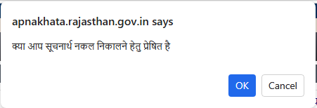 अगर आप जमाबन्दी देखना चाहते हैं तो उक्त स्क्रीन में "नकल (सूचनार्थ)" पर क्लिक करें, अगर आप जमाबन्दी की ई-साईन प्रतिलिपि लेना चाहते हैं तो उक्त स्क्रीन में "ई-हस्ताक्षरित अधिकृत नकल" पर क्लिक करें। "नकल (सूचनार्थ)" पर क्लिक करने पर स्क्रीन कन्फर्म मेसेज दिखाई देगाः-