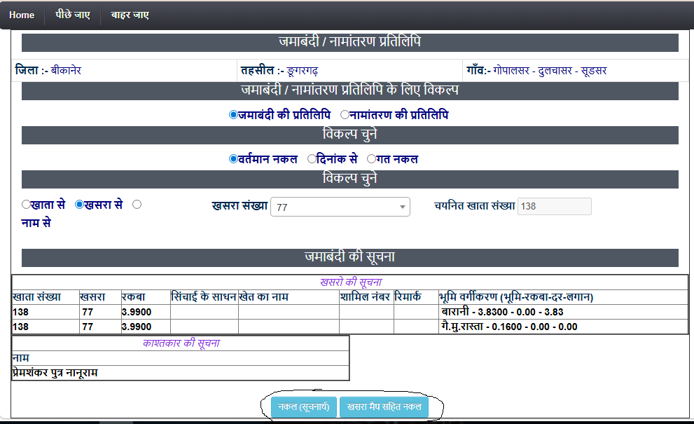 उक्त स्क्रीन में "जमाबन्दी की प्रतिलिपि" पर क्लिक करें। उसके बाद निम्न स्क्रीन दिखाई देगीः-