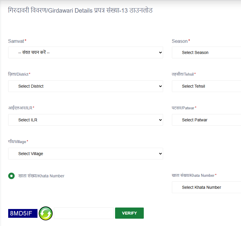 यहां पर आप सम्वत् व सीजन तथा अपनी कृषि भूमि का जिला, तहसील, आईएलआर(ILR), पटवार मण्डल, गांव और खाता संख्या