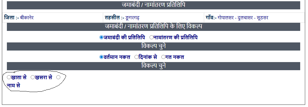 उक्त स्क्रीन में "जमाबन्दी की प्रतिलिपि" पर क्लिक करें। उसके बाद निम्न स्क्रीन दिखाई देगीः-