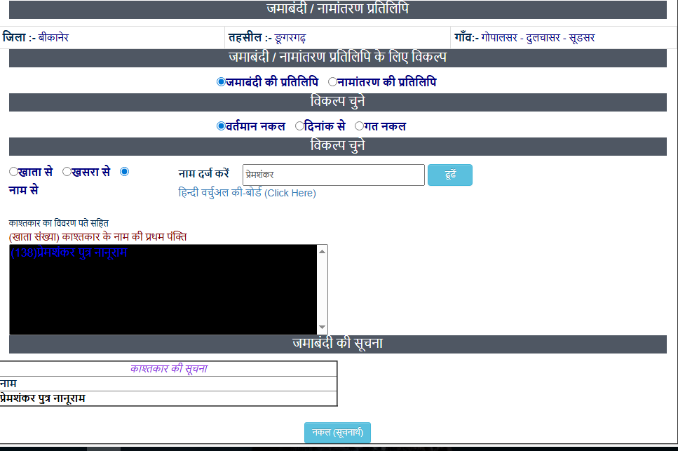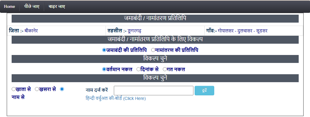 उक्त स्क्रीन में "जमाबन्दी की प्रतिलिपि" पर क्लिक करें। उसके बाद निम्न स्क्रीन दिखाई देगीः-